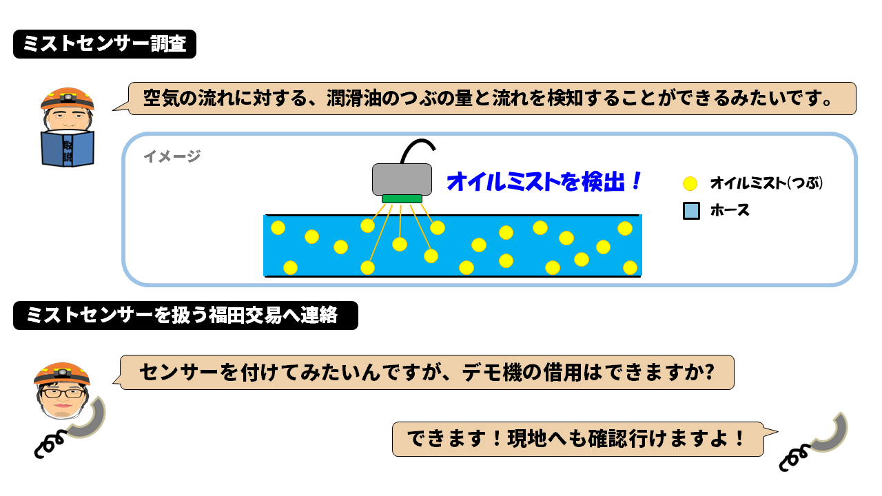 実際にMWM社製オイルミストセンサーのデモ機評価をしたところ、オイルミストがある時は検出、ない時は検出しないという望んでいた結果が得られ、トライは成功しました。